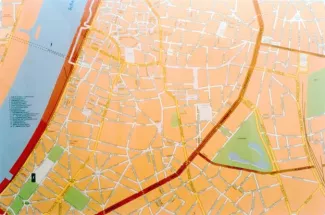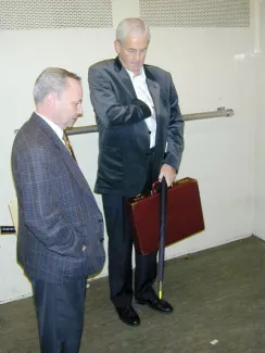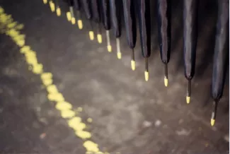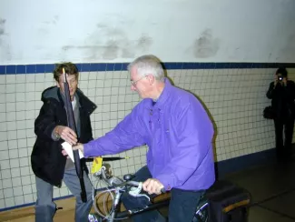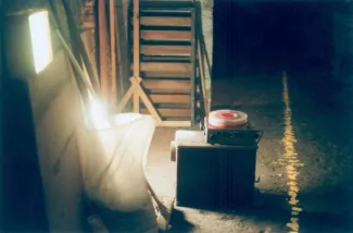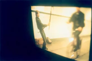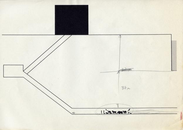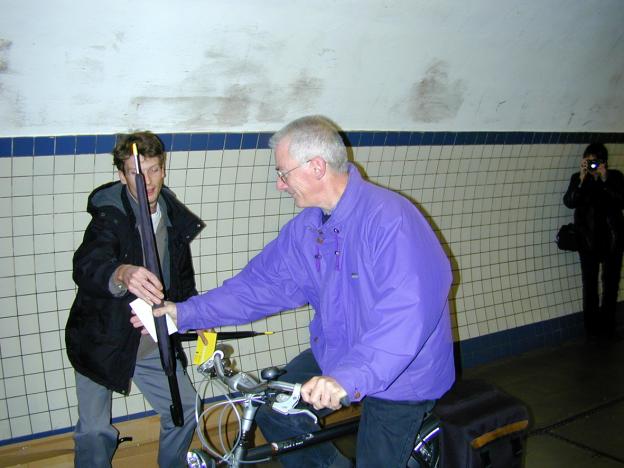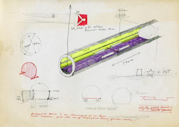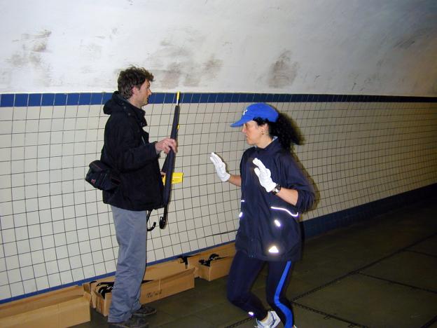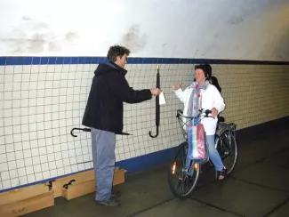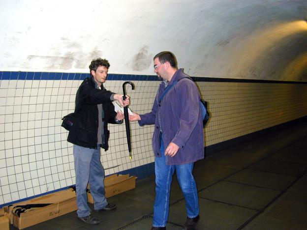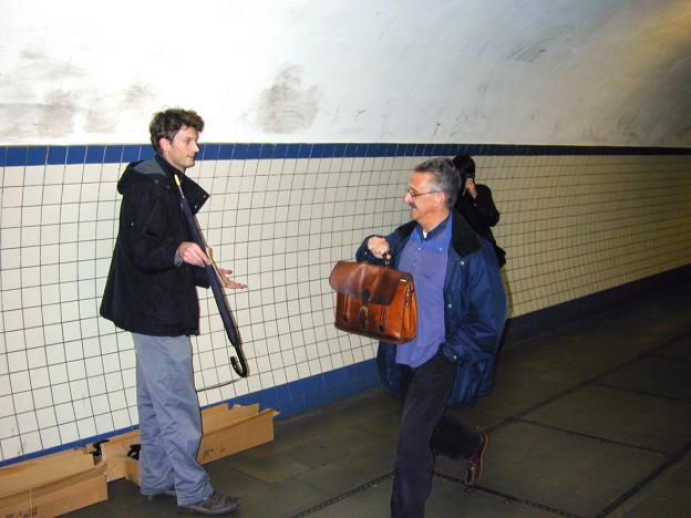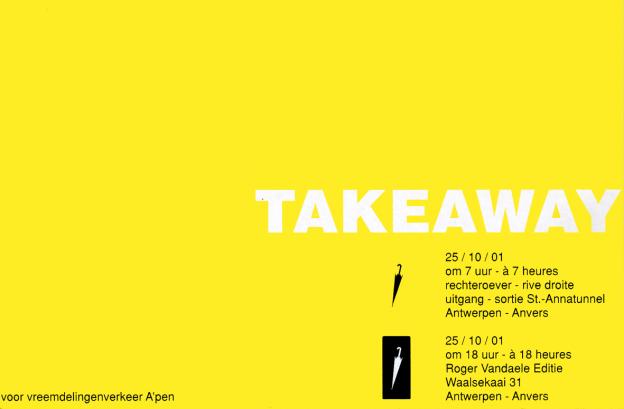 Using the pedestrian tunnel under the Scheldt in Antwerp as a blowpipe for the free distribution of one hundred yellow-tipped umbrellas, early in the morning on October 25, 2001.