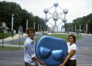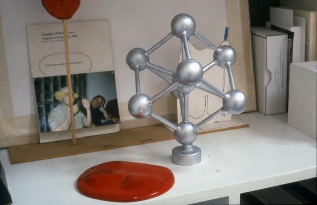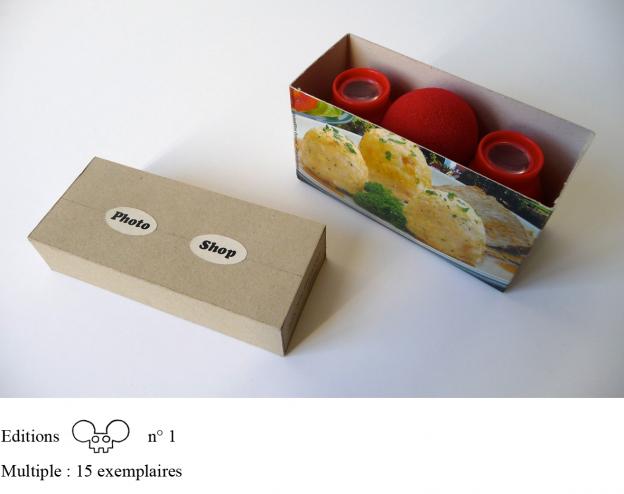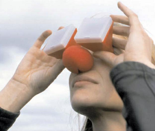 View master and accompanying red nose in a Knödel box, which contains pictures of clownish tribulations at the collector’s home.