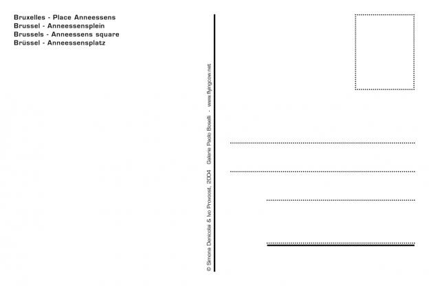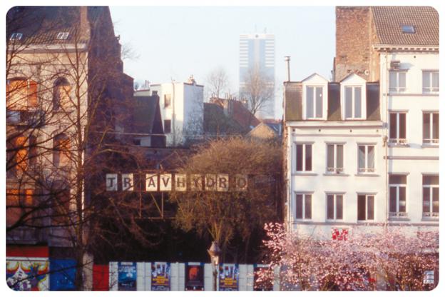 Postcard presenting a view on an advertisement of TR AVHYDR O, left on a vacant lot between two buildings on the Anneessens Square. The name and its spacing were reused in the title of a newspaper appearing at unfixed intervals between 2000 and 2003.