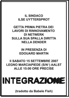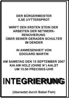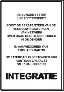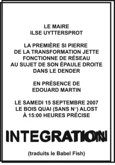 Reinvention of the first stone ritual: the mayor Ilse Uyttersprot throws the last stone of Netwerk’s renovation works over her shoulder into the river, as an appeasing gesture between an art centre and a city, reconciling art’s longing for unburdened immateriality with a desire to launch a pact with the citizens.