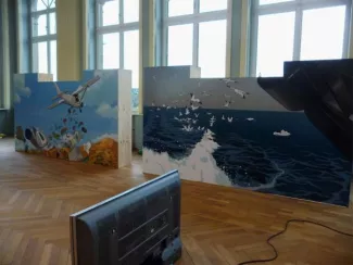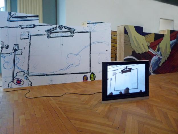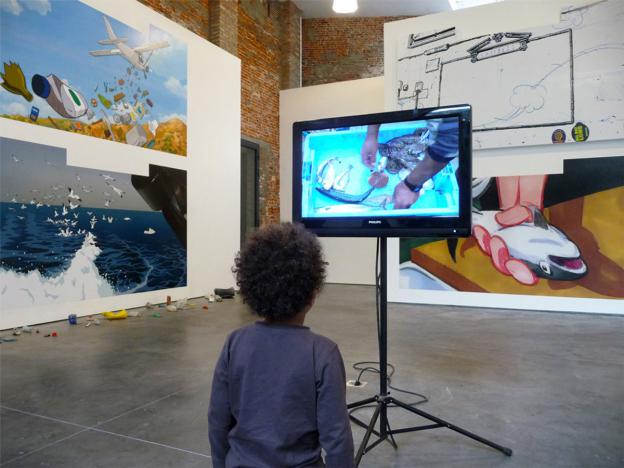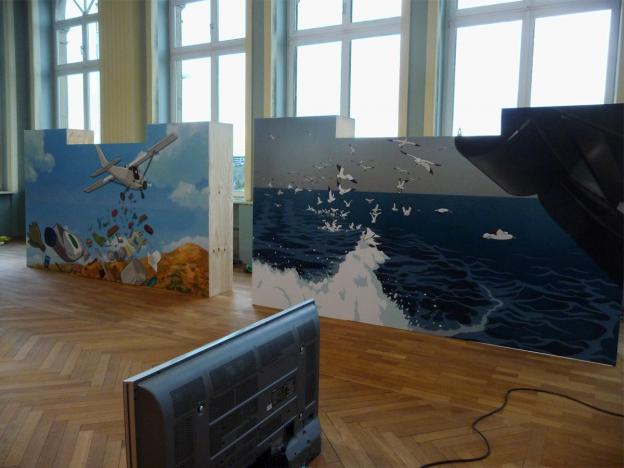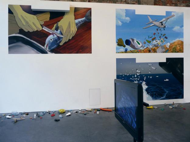 A fish and trash installation displaying multi-stage marvels of cartoon artistry that highlight and activate the incidental symbolism which pervades the humans’ inequitable dealings with the sea and its fauna.