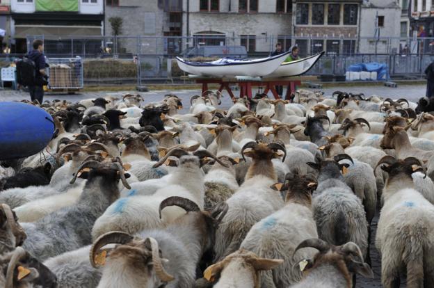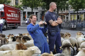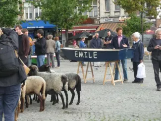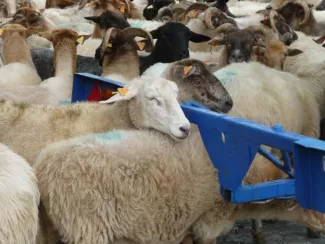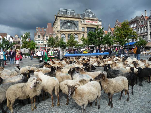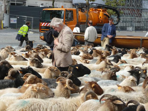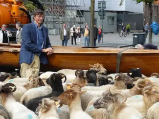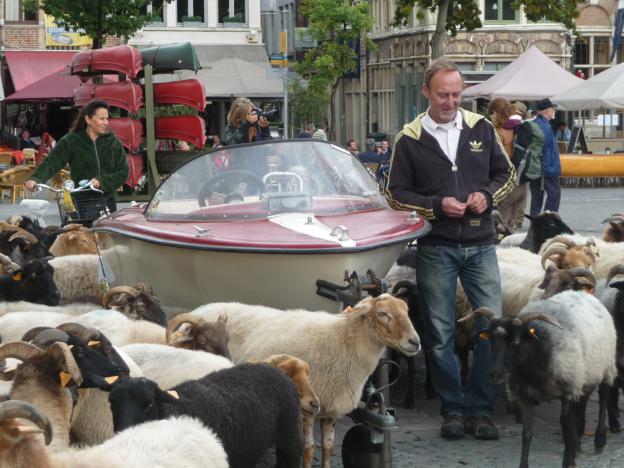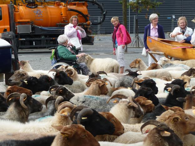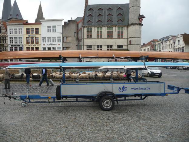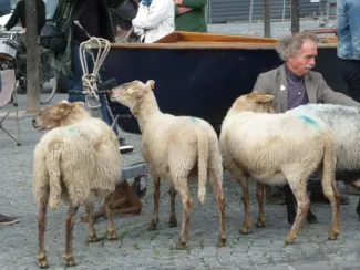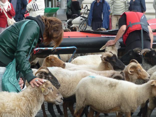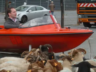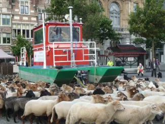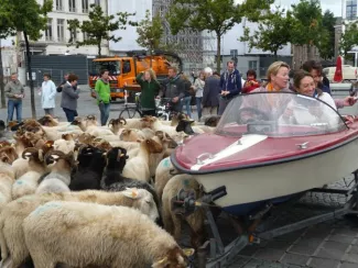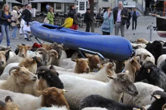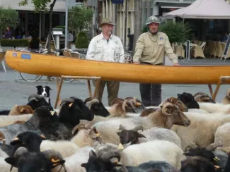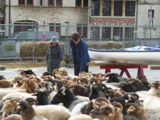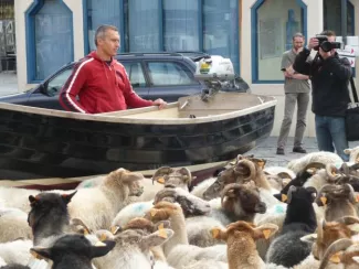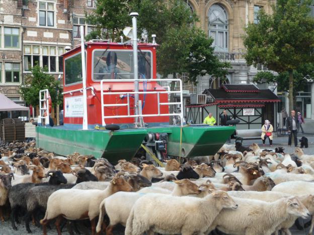 A gathering of two different gatherings at a ratio of 13.3 sheep per boat, with the two parties sharing the pleasure of a moment spent together, despite the lack of any identifiable statistical link between them.