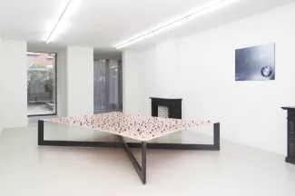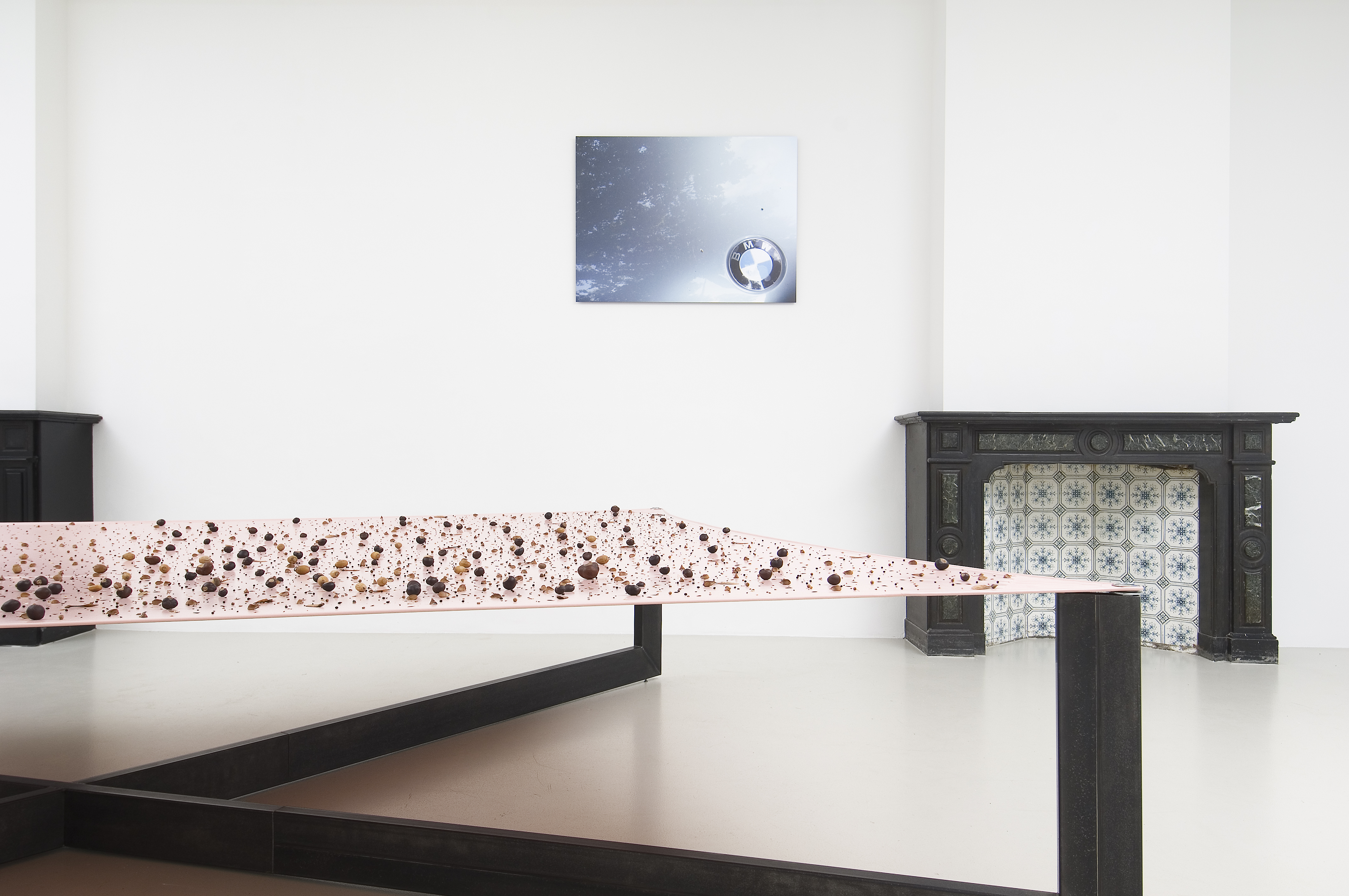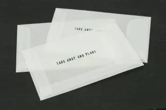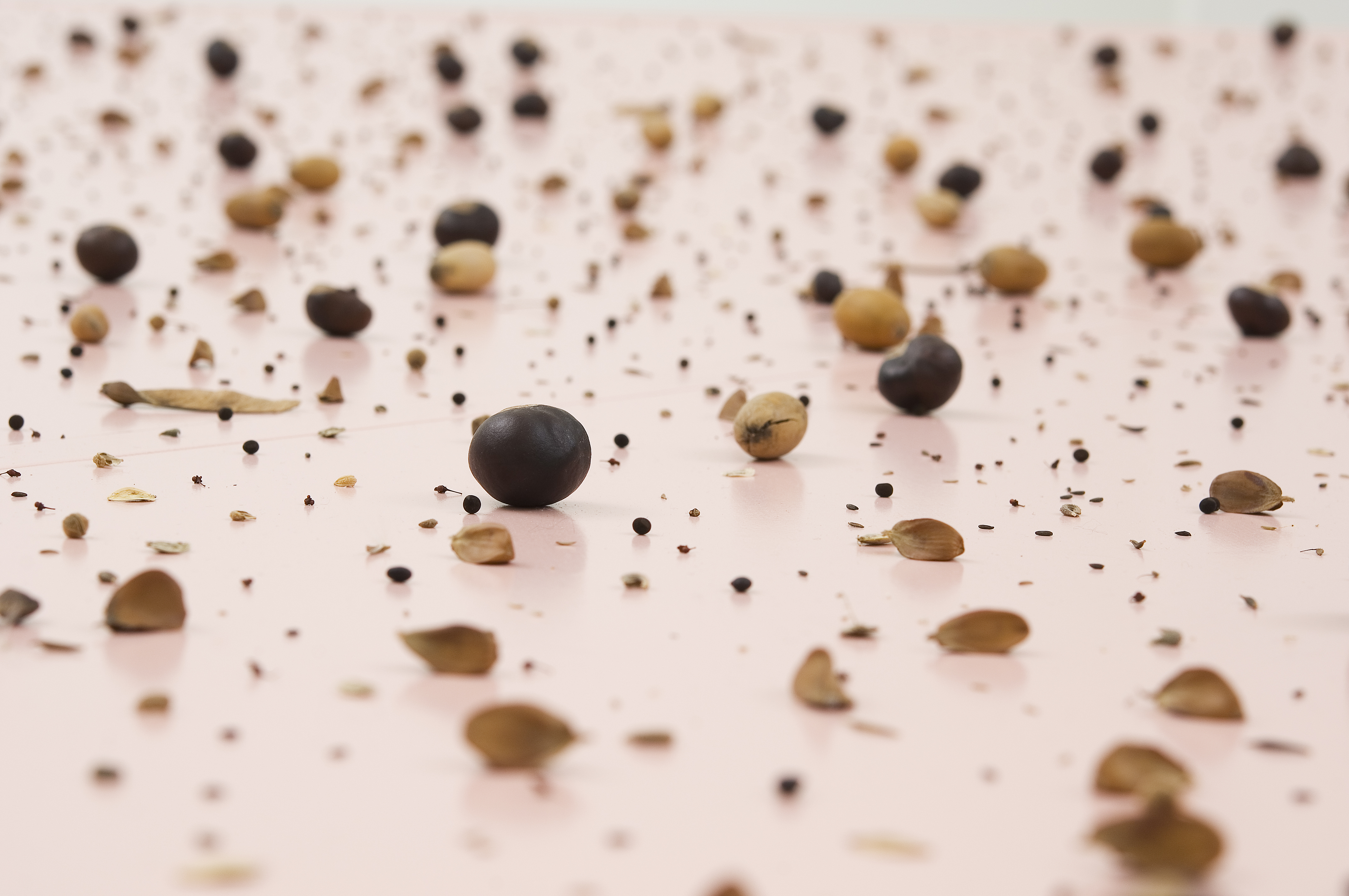 A tightly stretched canvas presenting handpicked seeds from the forest, extending their range of germination through the participation of the visitors.