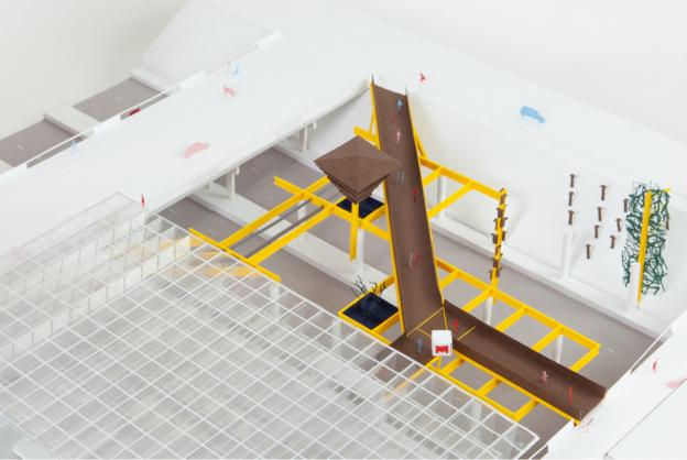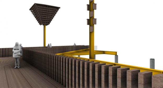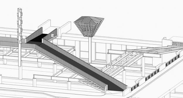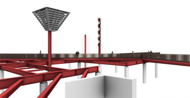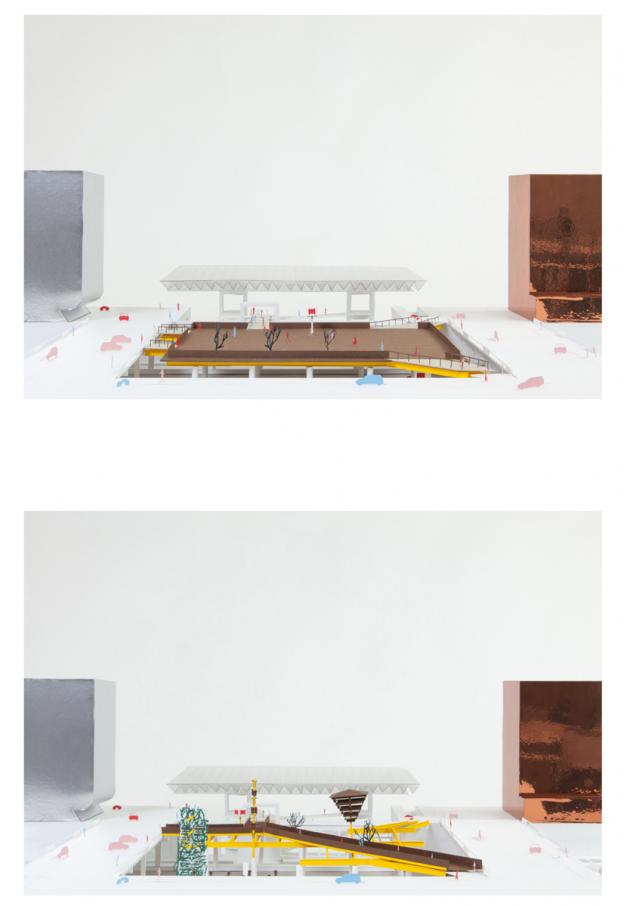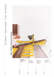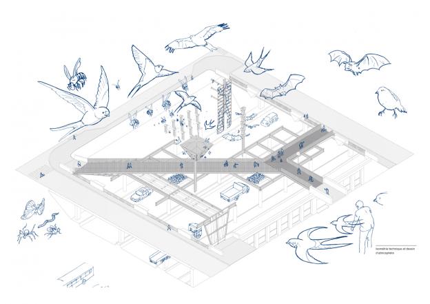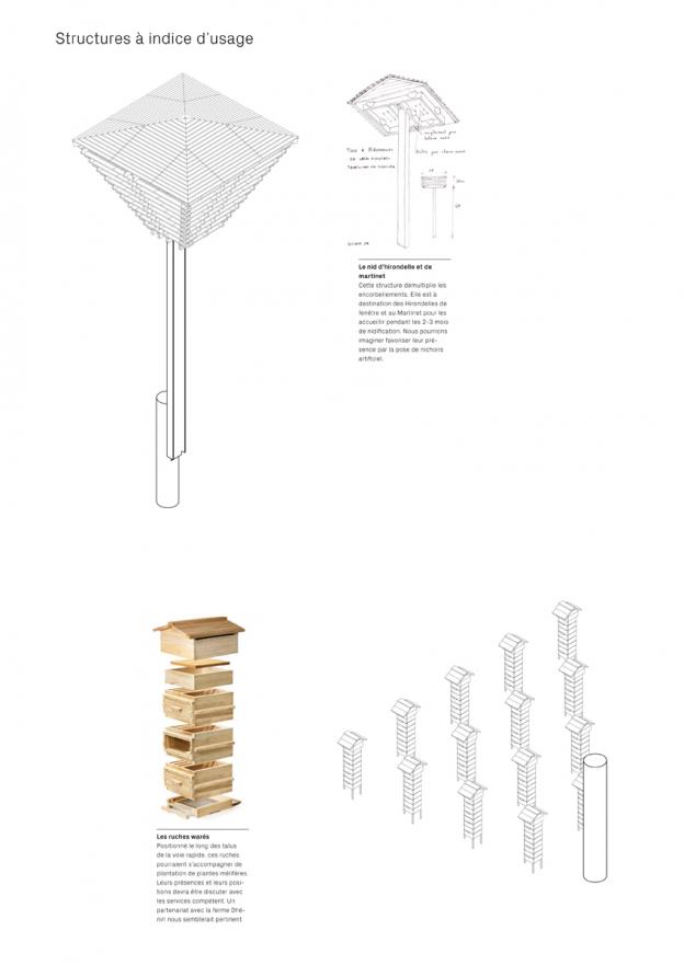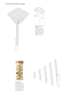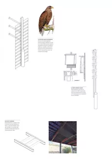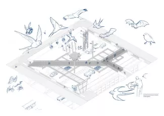 Unrealised project for the Valladolid square in Euralille, France. In this proposal, the urban furniture is to be adapted and rearranged according to the habits and preferences of its aviary population (and of the bats, bees, plants and other non-human residents). A collaboration between Nord - Greisch and Denicolai & Provoost